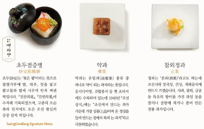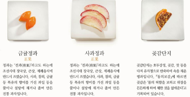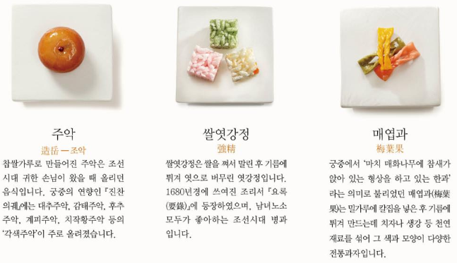 *원행을묘정리의궤(園行乙卯整理儀軌) : 조선 정조(正祖)가 화성으로 행차하여 아버지 사도세자의 묘인 현륭원(顯隆園)을 참배하고, 어머니인 혜경궁 홍씨(惠慶宮洪氏)의 회갑연을 열고 다시 궁으로 돌아가는 8일간의 기록. 기록에 따르면 다과상을 올리는 때에 따라 조다(早茶 : 새벽), 주다(晝茶 : 낮), 만다(晩茶 : 늦은 오후), 야다(夜茶 : 밤)로 구분하는데, 낮에 다과상을 올리는 주다(晝茶) 때 가장 많은 종류의 병과(6~9종)가 올려졌다고 한다.
