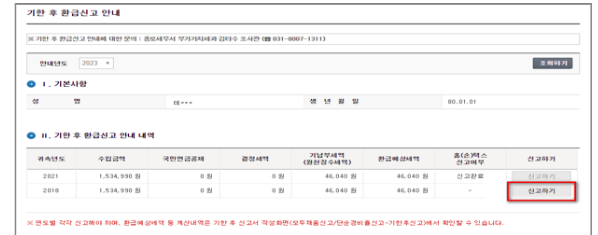 안내문의 '환급금 조회 바로가기' 버튼을 터치하면 최근 5년간 연도별 수입금액과 환급예상세액이 조회 됩니다.