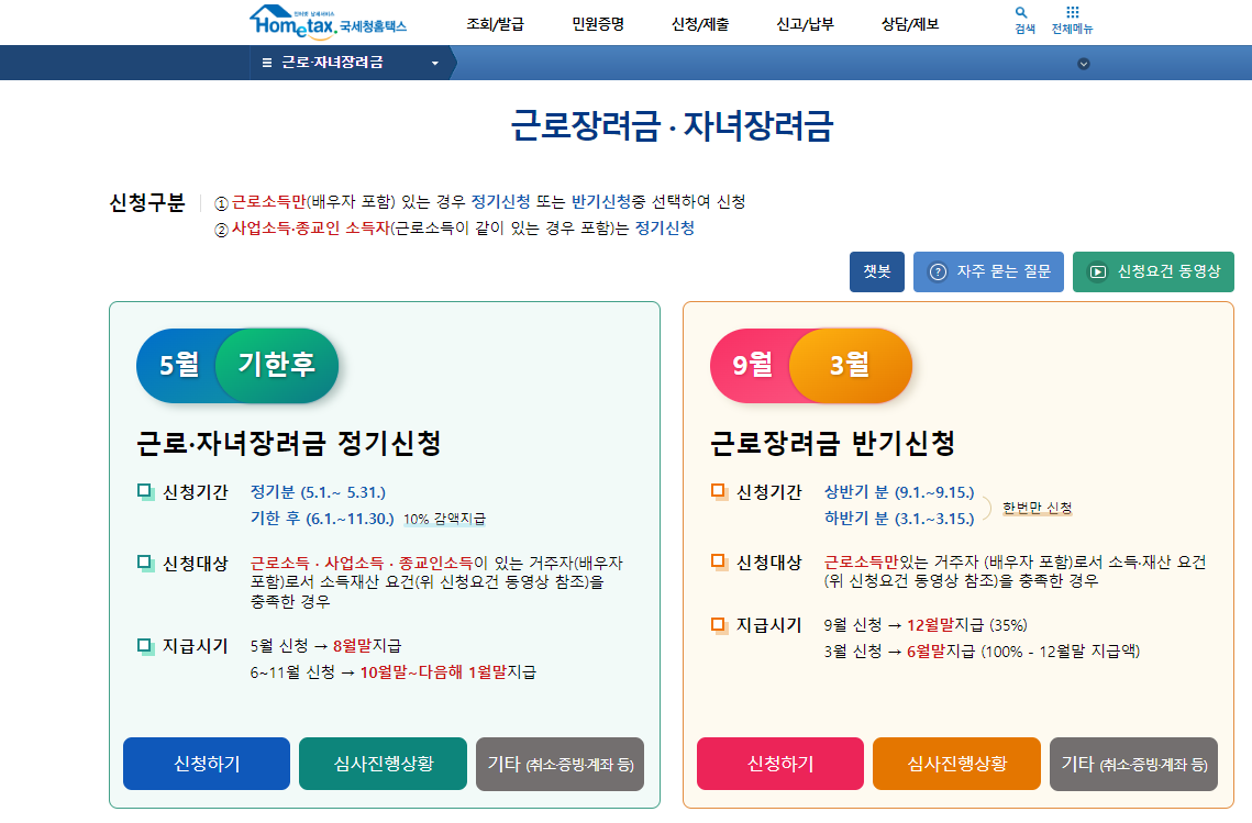 www.hometax.go.kr 접속 → 로그인 → 신청/제출 → 『 근로·자녀장려금 』 → 근로장려금(정기/반기) 신청