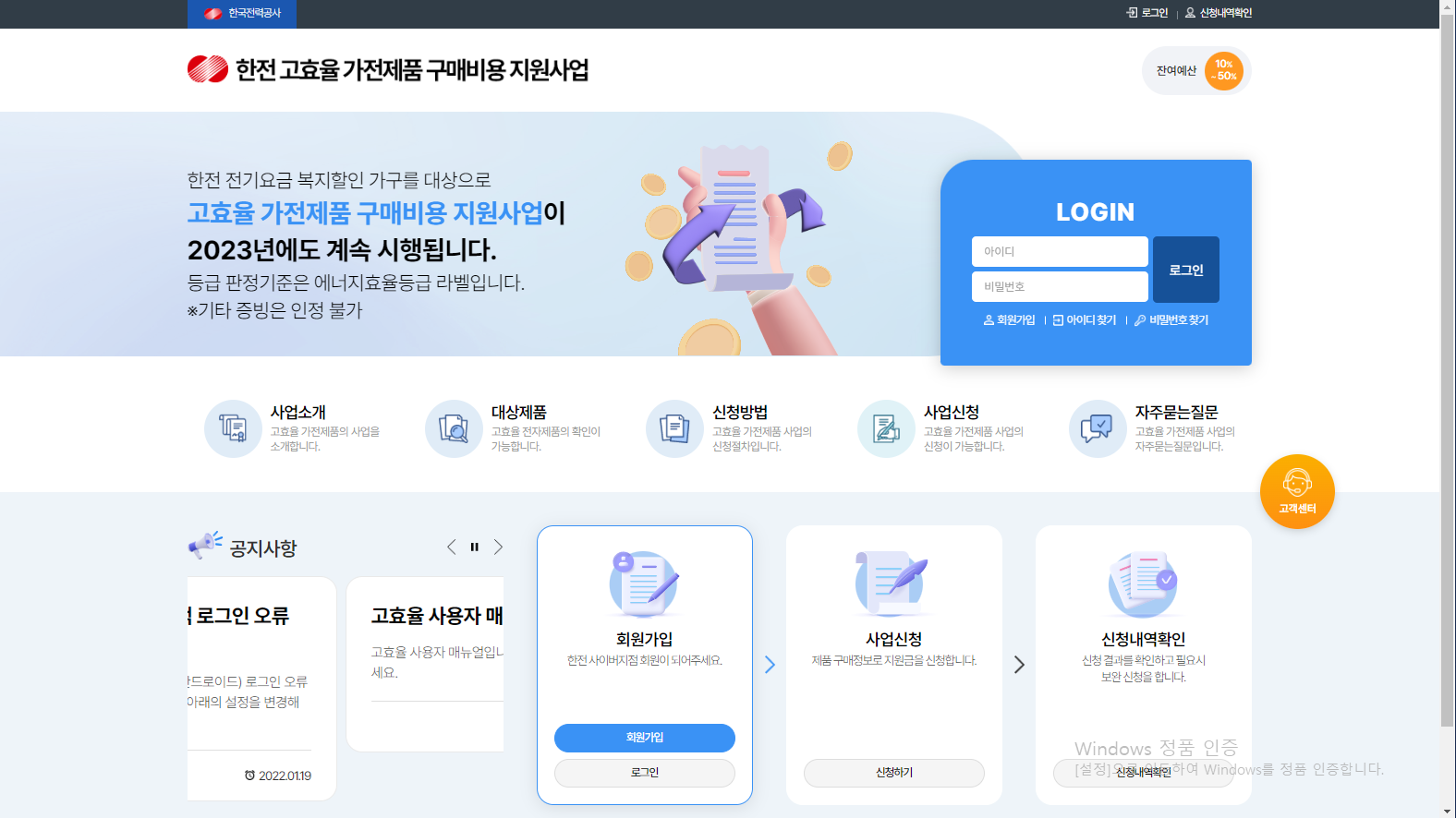 신청방법 : 한전 고효율 가전제품 구매비용 지원사업 접속 → 로그인 → 대상자 확인 → 계좌등록 → 사업신청
