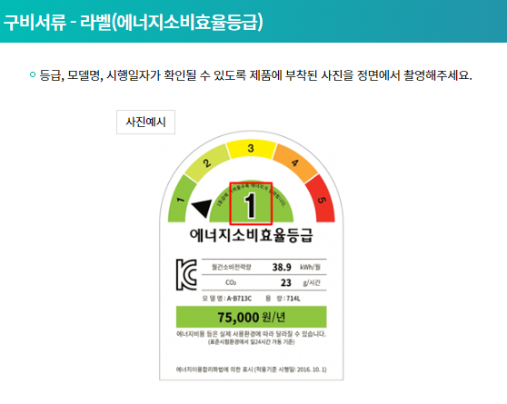 ②라벨(에너지소비효율등급) - 등급, 모델명, 시행일자가 확인될 수 있도록 제품에 부착된 사진을 정면에서 촬영
