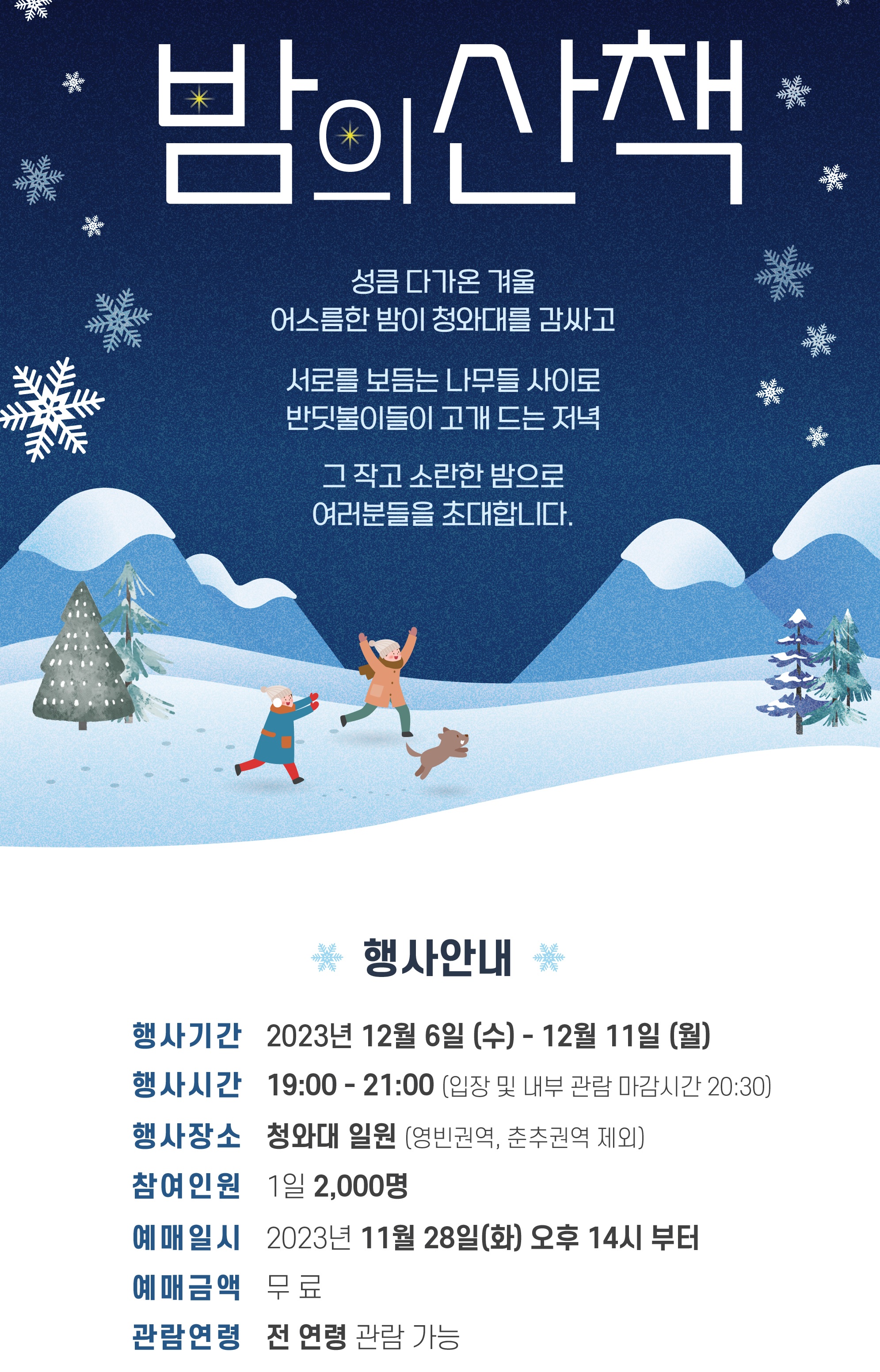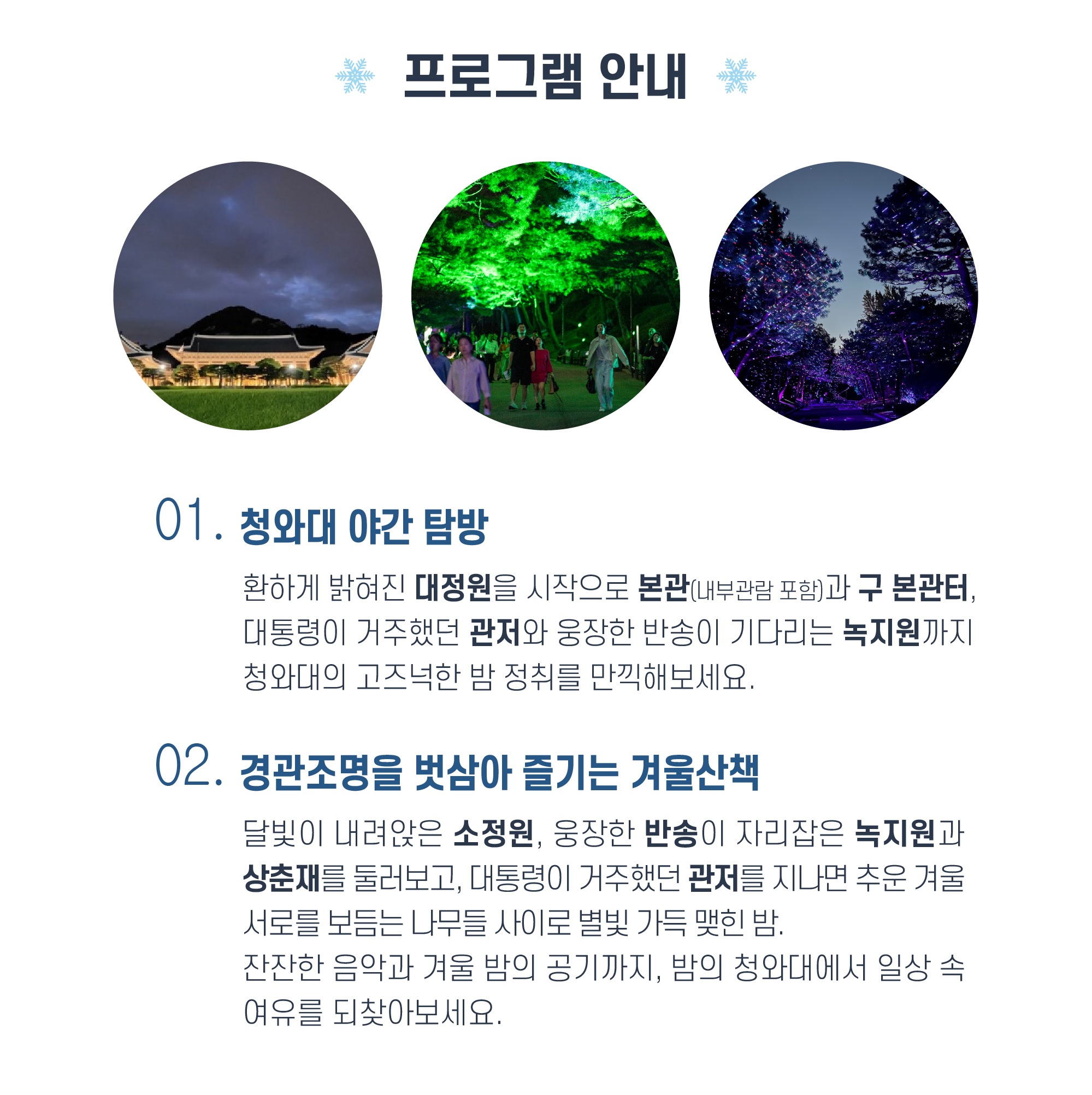 1. 청와대 밤의산책은 주간관람과 별개로 야간에 진행되는 행사로 별도의 예매가 필요합니다. 주간관람 예약으로 야간 관람은 가능하지 않습니다.